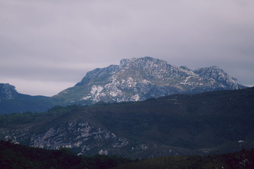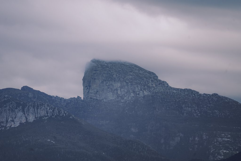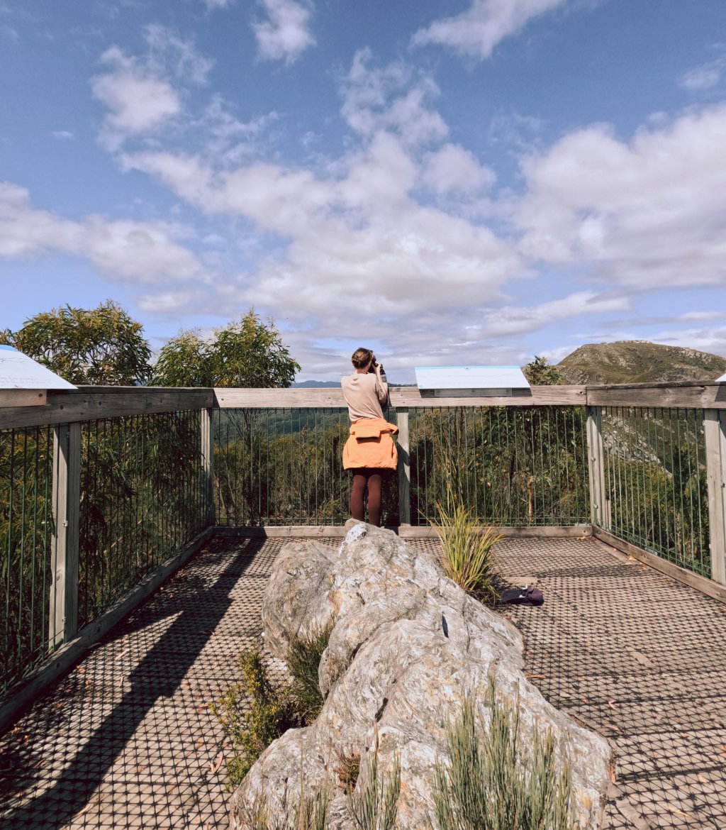 The lookout sits on a rocky outcrop with sweeping views across the peaks of Western Tasmania. On a clear day, Frenchmans Cap is the most recognisable shape, rising above the surrounding ranges with its distinctive silhouette.
