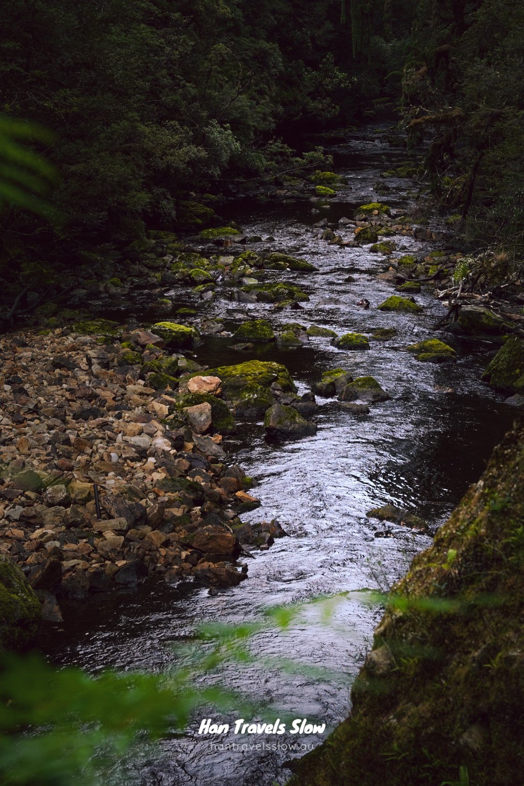 A gentle 1 km loop through mossy rainforest to the banks of the Franklin River, ideal for slowing down on the Lyell Highway.