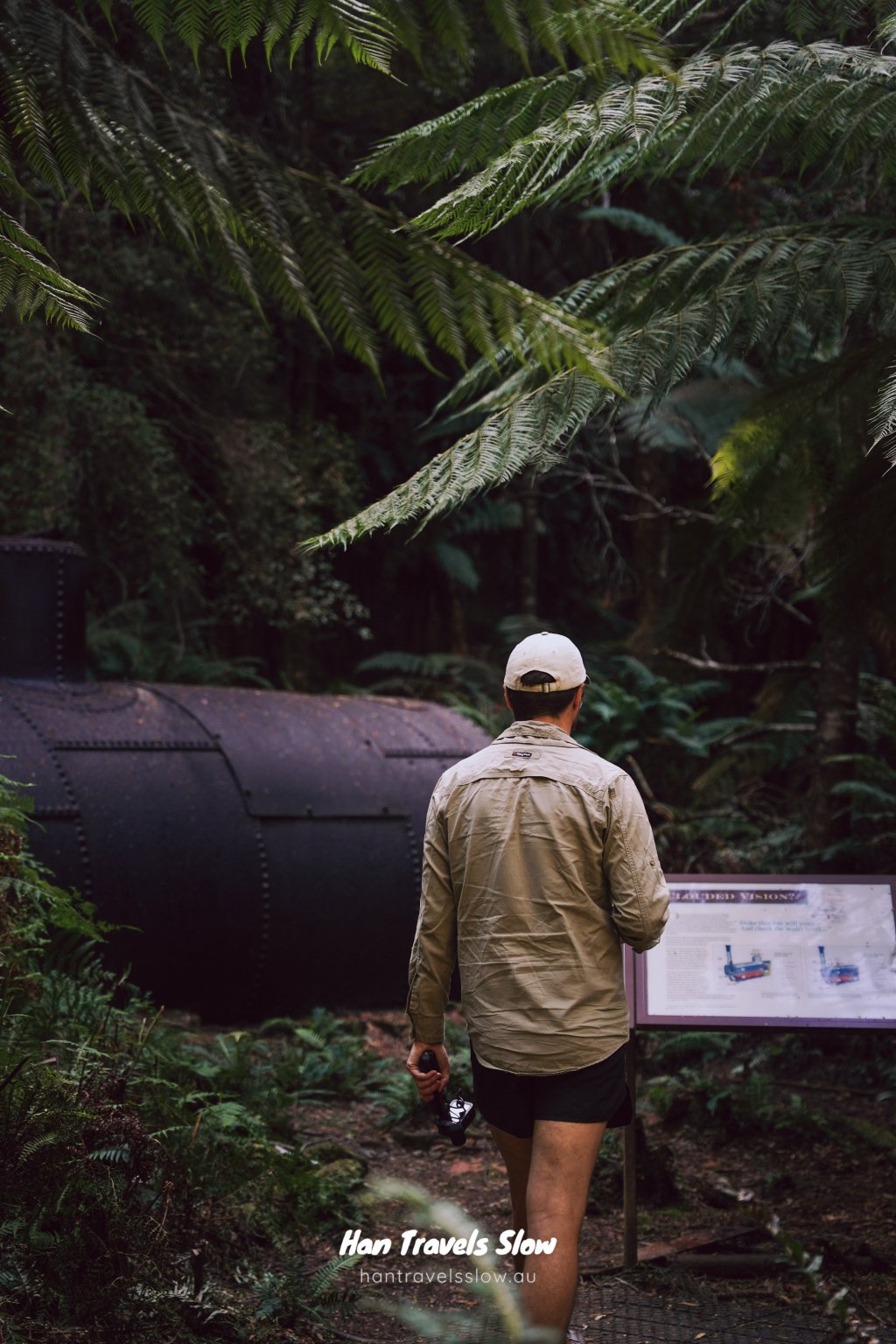 The walk follows the old North Mount Lyell Railway corridor. Once you know what to look for, you will start noticing signs of it everywhere: flat terraces where embankments once ran, narrow rock cuttings, old formations and industrial fragments left behind by the forest.