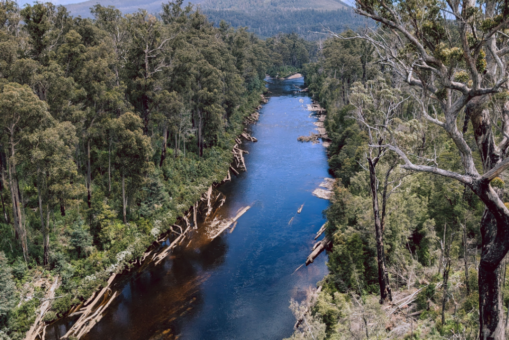 A spectacular elevated walkway through the forest canopy, high above the rivers of Tasmania's wild southwest.