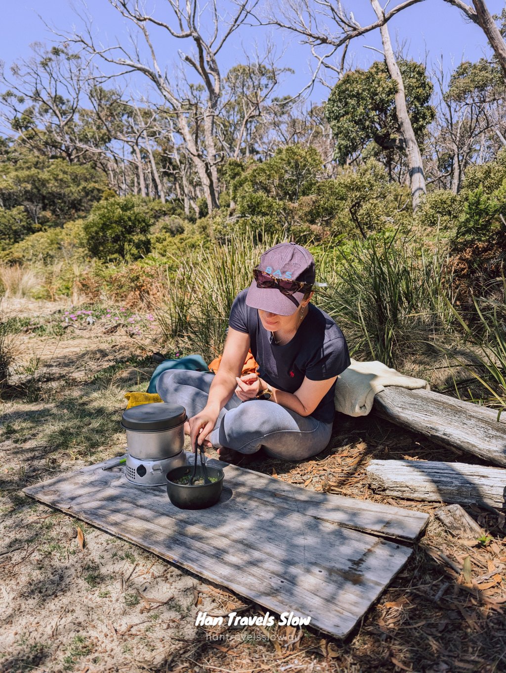Several beaches along the peninsula are backed by grass and sheltered from prevailing winds, making them ideal places for longer breaks. Butlers Beach stands out as one of the best spots to stop for lunch. We packed the Trangia and cooked hiking risotto here, sitting on the grass in the shade. If you have the time, this is a great way to break up a long — and at times quite monotonous — walk.