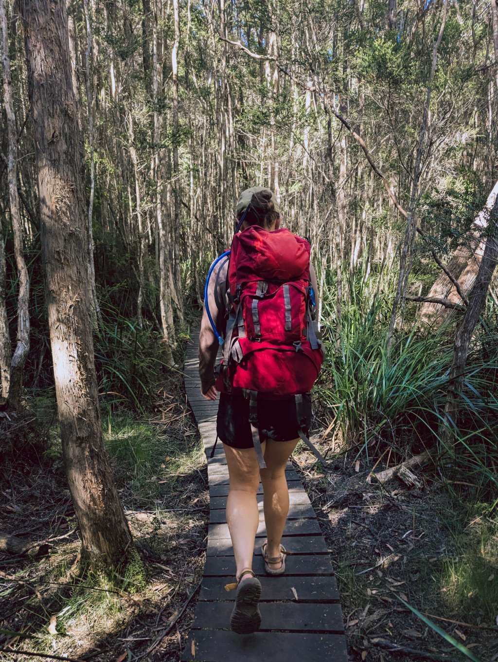 The forested sections are generally firm underfoot, while the buttongrass plains can feel exposed and windy. The duckboard is narrow in places and can be slippery when wet. Near the coast, sandy sections slow progress slightly.