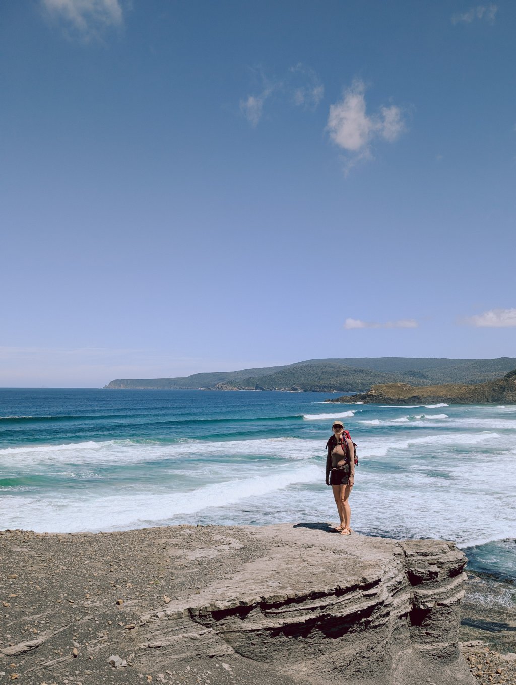 South Cape Bay marks the endpoint of that long wilderness route, which means day walkers briefly share the landscape with people who’ve been living out of their packs for a week or more.